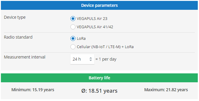 Tool for calculating the runtime of batteries for VEGAPULS Air devices.